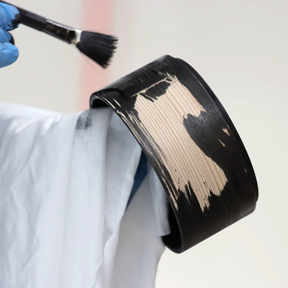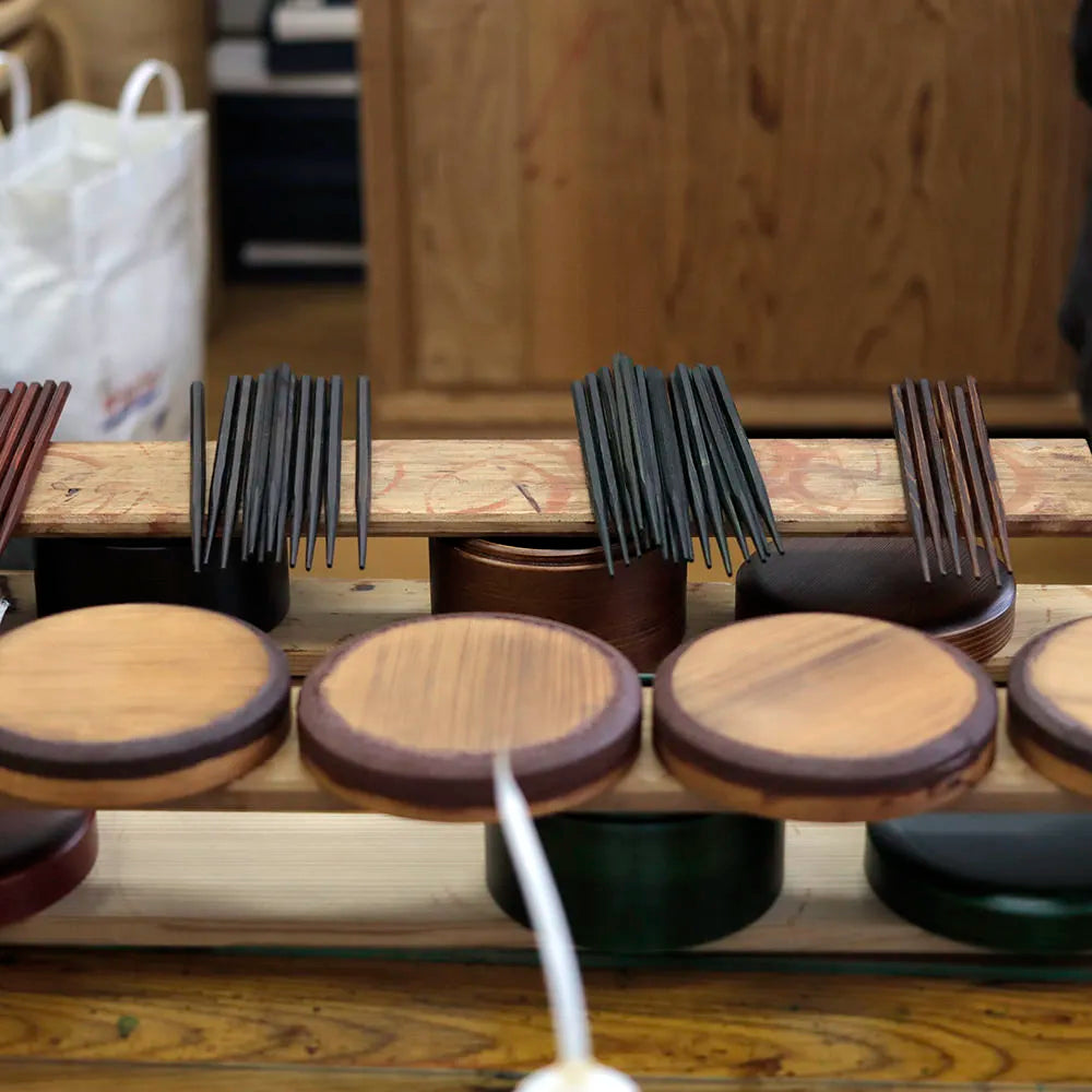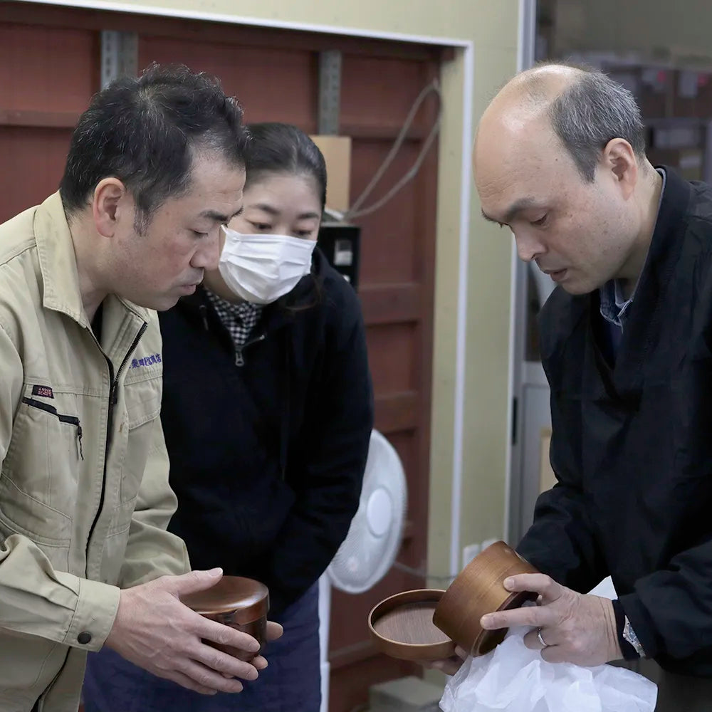 熊谷晃氏が講師となり、漆塗装の講習会を数回にわたり実施。伝統工芸士の柴田昌正を筆頭とした作り手が、拭き漆塗装の手順から、木地の補修・補強方法まで、伝統的な漆芸技術を得る機会となりました。