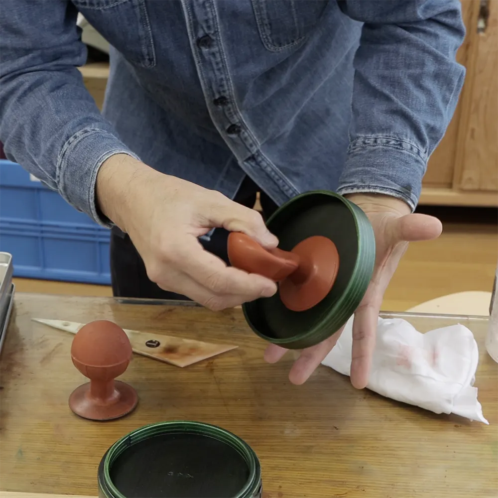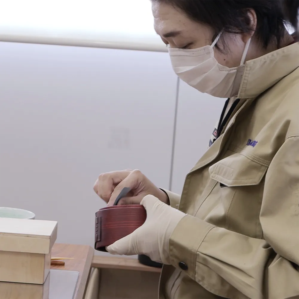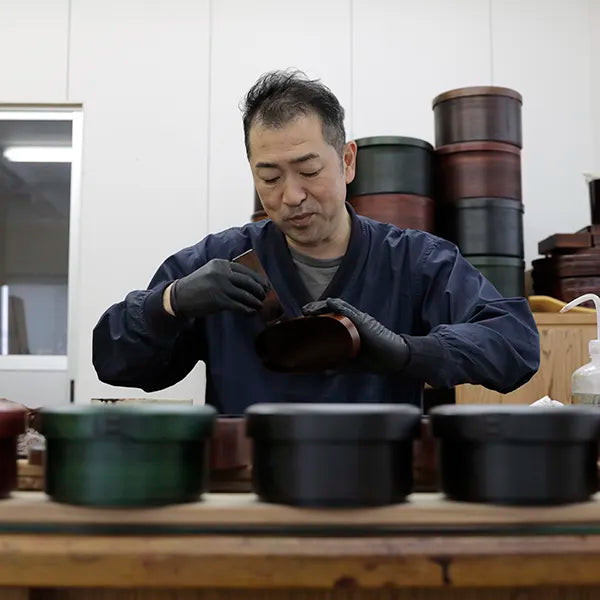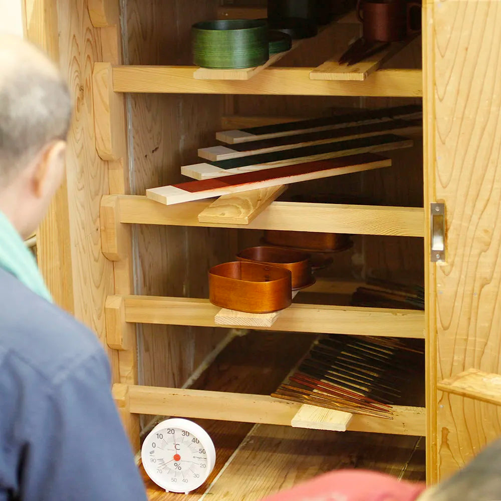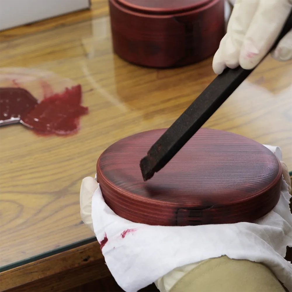 Before painting, the wood material is lightly sanded. A transparent color lacquer with a ROIRO finish or raw lacquer is applied to the wood, and then wiped off with a cloth. After applying lacquer to the sanded wood, it is wiped off with wiping paper. The lacquer application and wiping process is repeated five times. Once the painting is complete, the finished product is left to dry in a room called MURO. After the final coat, it must be allowed approximately one month for drying.