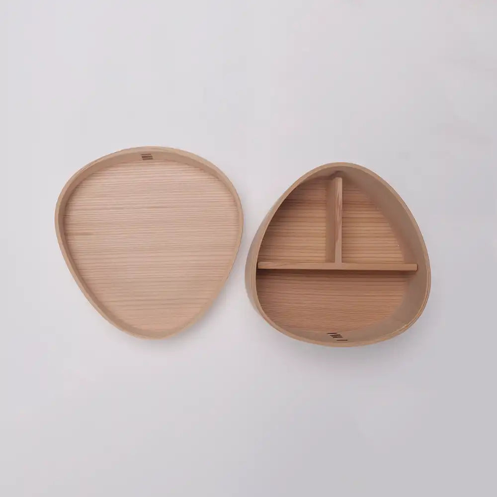 一回り大きくなった三角形のおむすび弁当箱。付属するT字の仕切りはご飯とおかずのレイアウトを手助けするお弁当作りの強い味方です。熱々のご飯で握ったおむすびと一緒に、彩り鮮やかなおかずを詰めて賑やかに。もちろん、炊き立てのご飯を詰めて、いつものお弁当箱としても。三角形の蓋を開ける楽しみは広がります。