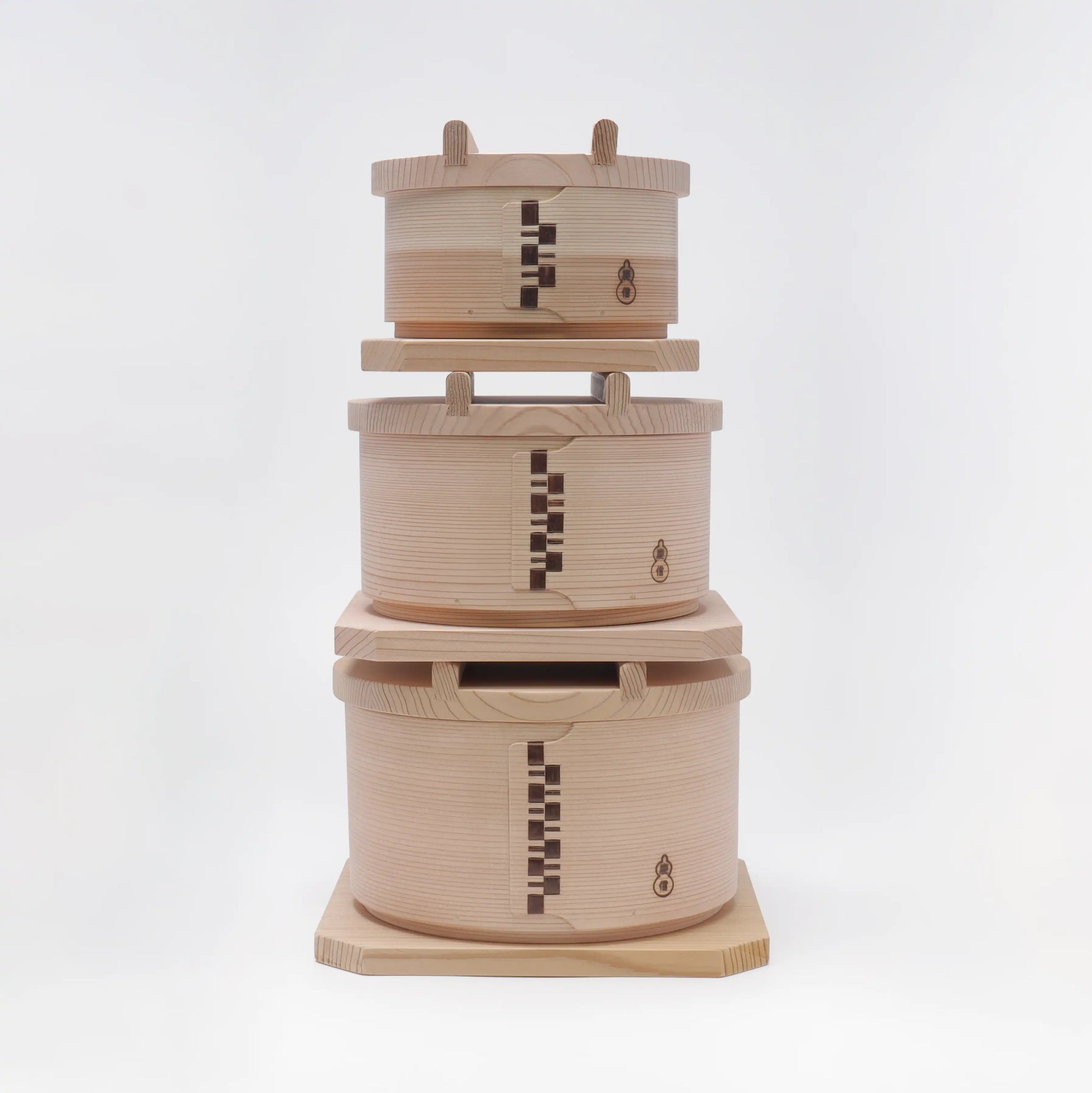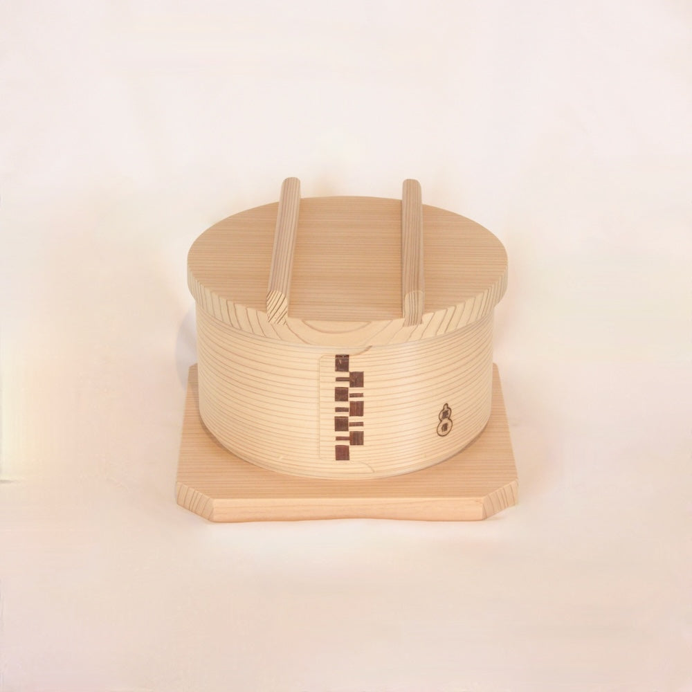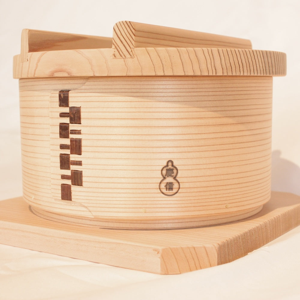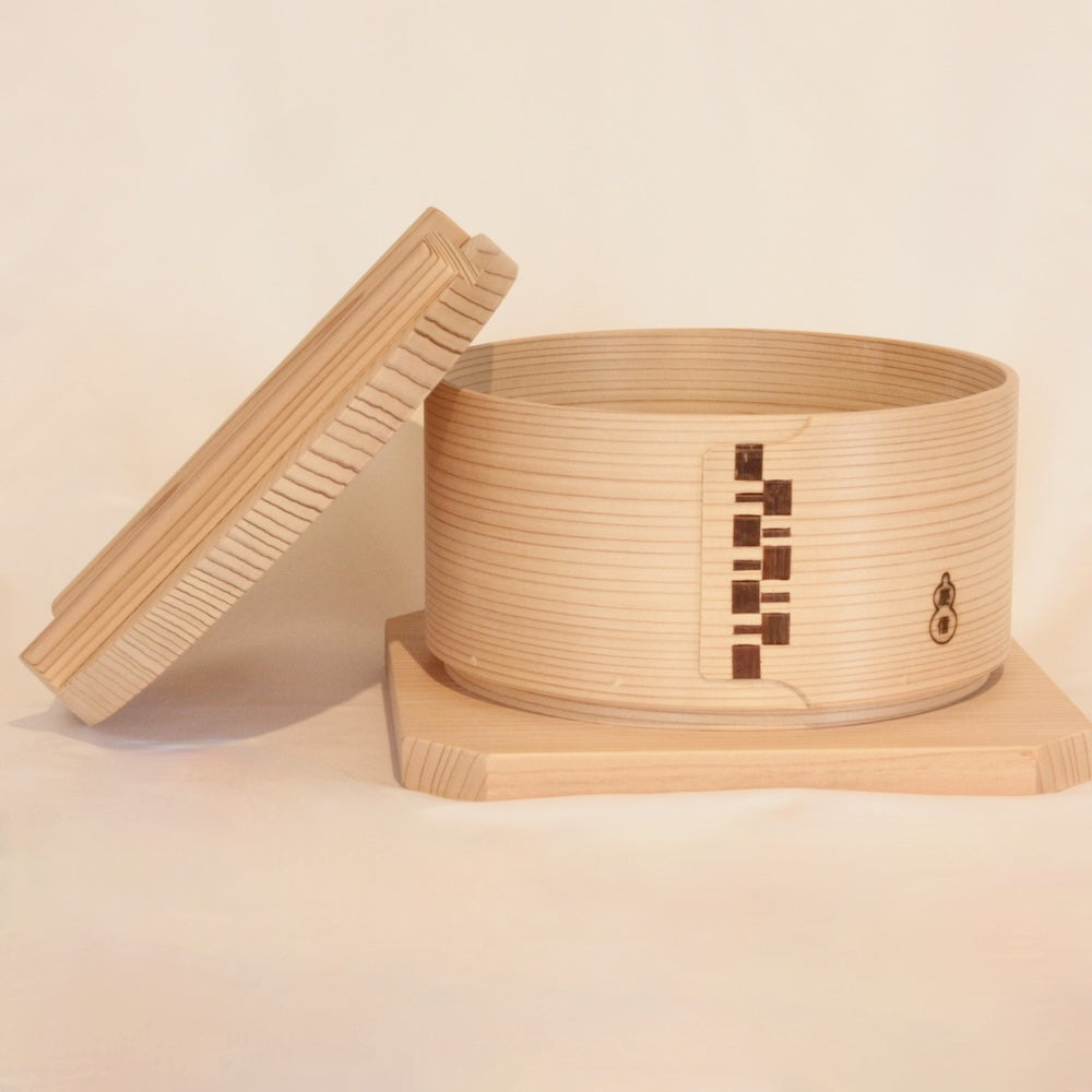 胴体は天然杉の曲げもので形作り、伸縮性のある山桜の木皮で綴じています。蓋は杉の厚板。底は竹籠。水気に強く熱をしっかりと閉じこめ隅々まで行き渡らせます。余分な蒸気を吸って食べ物に滴が垂れません。食材の旨味を逃さず、そのままの美味しさを味わっていただけます。